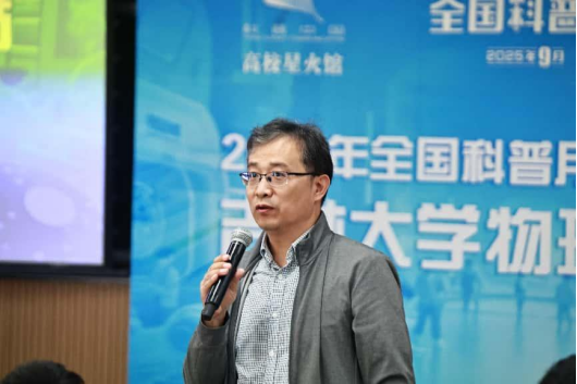 开幕式在逸夫楼第七阶梯教室举行。吉林大学科学技术协会副秘书长王立锋出席并宣布活动启动。物理学院郑以松教授带来《量子百年》专题科普报告,系统梳理了量子力学从诞生到发展的关键历程,生动阐释了量子纠缠、量子隧穿等核心概念,并结合量子通信、量子计算等前沿技术,展望了量子科技在未来信息时代的广阔前景。报告现场座无虚席,听众沉浸其中,互动频频。“原来量子物理并不遥远,它正在悄悄改变我们的生活!”一位参与活动的中学生兴奋地表示,“郑老师的讲解既严谨又有趣,让我对物理产生了强烈的好奇心。”